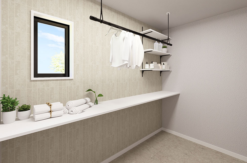 ■カウンター付きランドリールームで、「洗う・干す・畳む」までが一か所で完結。