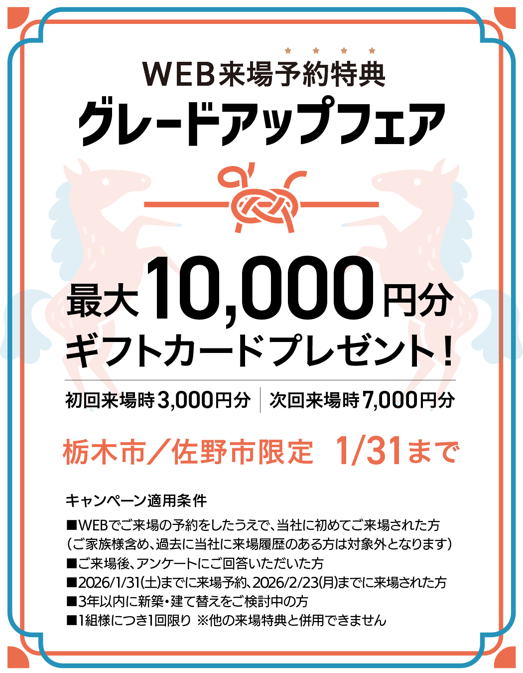今だけ!栃木市と佐野市にご来場の方限定で、非常にお得な期間限定キャンペーン「来場予約特典グレードアップフェア」が開催中です。WEBから来場予約をしてアンケートに答えるだけで、最大10,000円分のギフトカードがプレゼントされます!